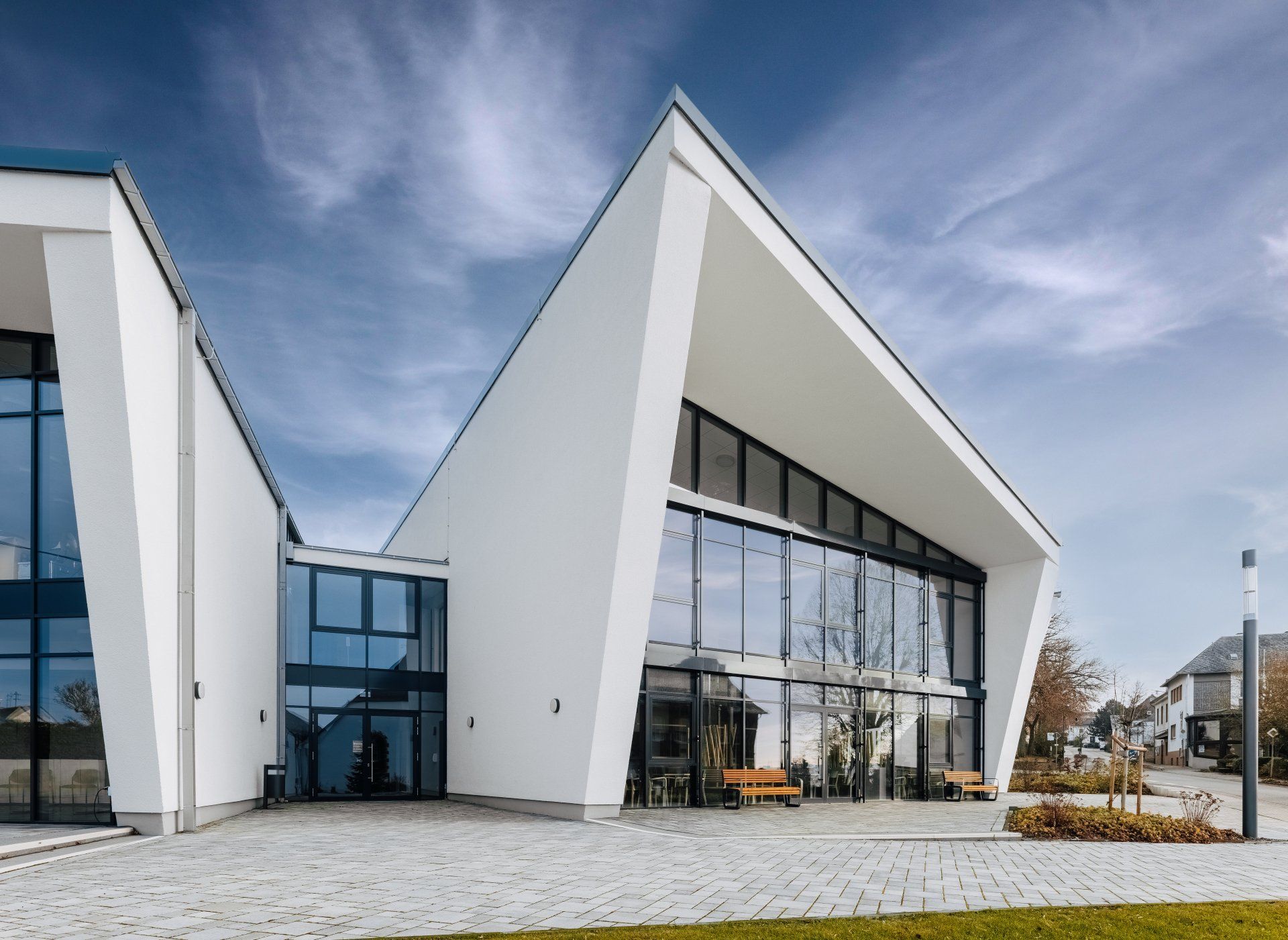 In der Hunsrück-Gemeinde Halsenbach ist ein Gebäude entstanden, das die Blicke auf sich zieht: Pultdächer mit schrägen Dachanschnitten und eine moderne Fassade mit großen Glaselementen. „Wir waren uns durchaus bewusst, dass die Gestaltung des Gebäudes etwas sehr Außergewöhnliches ist“, erklärt Stefan Rieß, Architekt und Geschäftsführer DILLIG architekten. „Die auffallende Konzeption unterstützt durch die starke Verbindung von Innen nach Außen die Belebung und Vitalität des Gemeindezentrums und genau das wollten wir erreichen“. Gemeinsam mit dem Architekturbüro Schellenberg, das sich auf die Innenraumgestaltung fokussiert hat, hat DILLIG architekten für die Ortsgemeinde Halsenbach das Gemeindezentrum realisiert und alle Leistungsphasen vom ersten Entwurf bis hin zur Bauleitung umgesetzt.