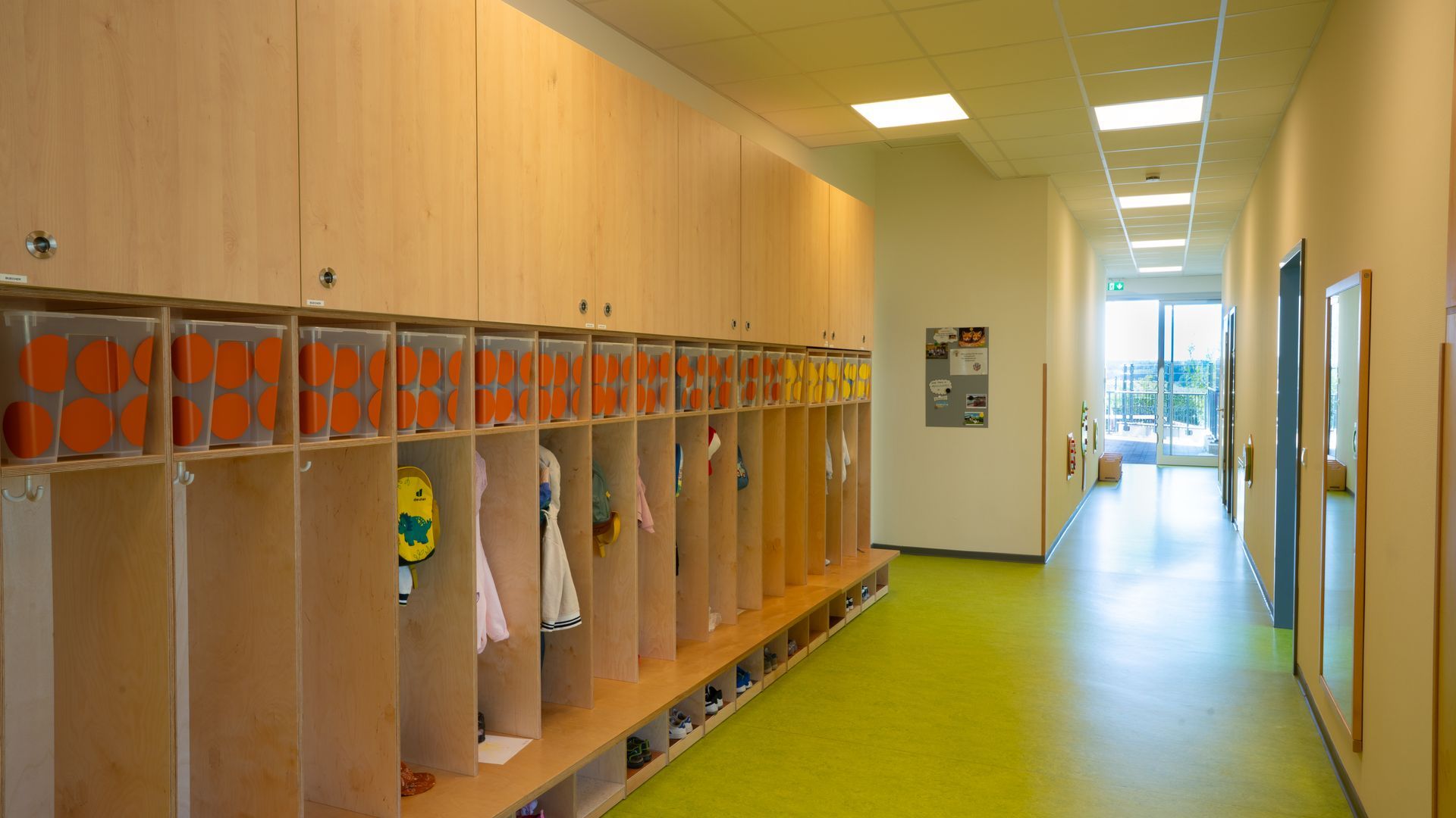 Der neue Anbau umfasst insgesamt 277 Quadratmeter und bietet Platz für zwei weitere Krippengruppen mit zugehörigen Schlafräumen, einen modernen Sanitärbereich, einen hellen Spielflur und eine kindgerechte Mensa. Zusätzlich wurde eine komplett ausgestattete Frischeküche errichtet – inklusive Spülküche, Tiefkühllager, Personaltoiletten, Pausenraum und Büro-, die künftig auch von der geplanten katholischen Kita in der Nachbarschaft mit genutzt werden kann. Mit der Erweiterung wächst die Gesamtkapazität der Kita Gänsacker auf insgesamt 90 Betreuungsplätze.